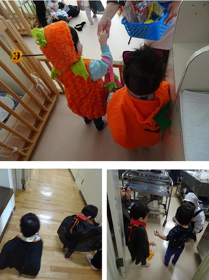 乳児院の中は笑い声でいっぱい。ベビークラス、ほしぐみ、厨房、それぞれのお部屋を回って「トリックオアトリート!」と小さな手でお菓子をもらい大事そうに握りしめる姿がとても微笑ましかったです。もらったおやつをみんなでいただきました。いつもと違った雰囲気でみんなニコニコ笑顔でした。